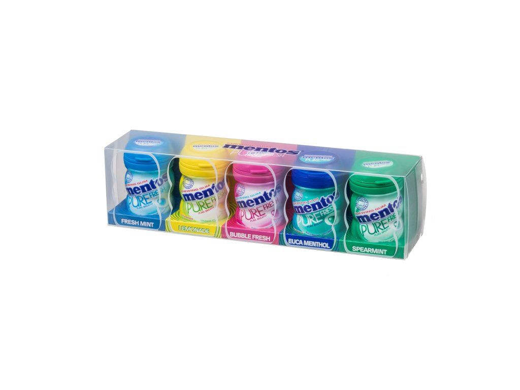 Idealny prezent dla dzieci, młodzieży i dorosłych. Opakowanie zawiera 5 praktycznych puszek wypełnionych 5 znanymi i popularnymi smakami: Pure Fresh: Fresh Mint, Spearmint, Euca Menthol, Bubble Mint i Lime Mint. Zamykane pojemniki ułatwiają spożywanie gumy do żucia i jej przechowywanie. Gdy puszki się opróżnią, możesz je ponownie napełnić nową gumą do żucia Mentos.