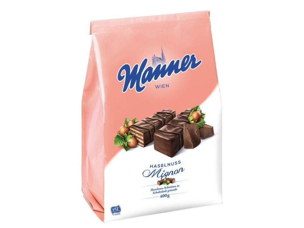 Gofry Manner Mignon to chrupiące kawałki w polewie z ciemnej czekolady. Wypełnione są szczególnie delikatnym kremem kakaowym i ORZECHAMI LASKOWYMI, które dopełniają czekoladowy smak.