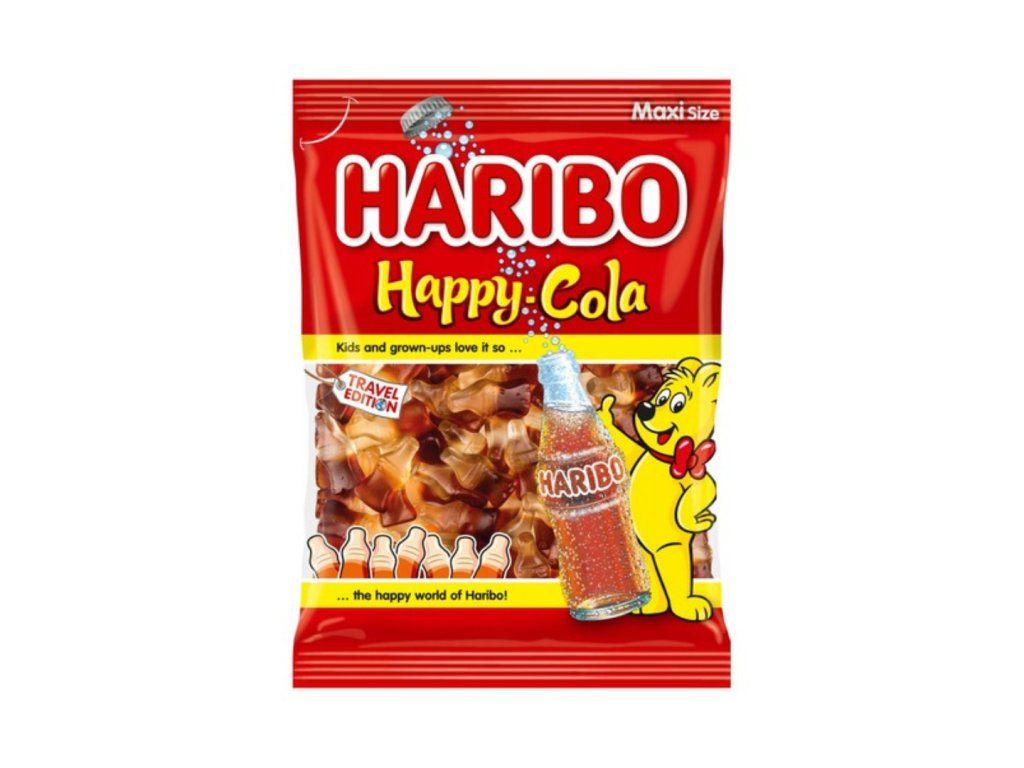 Haribo Happycola to opakowanie żelków w kształcie małych butelek coli.